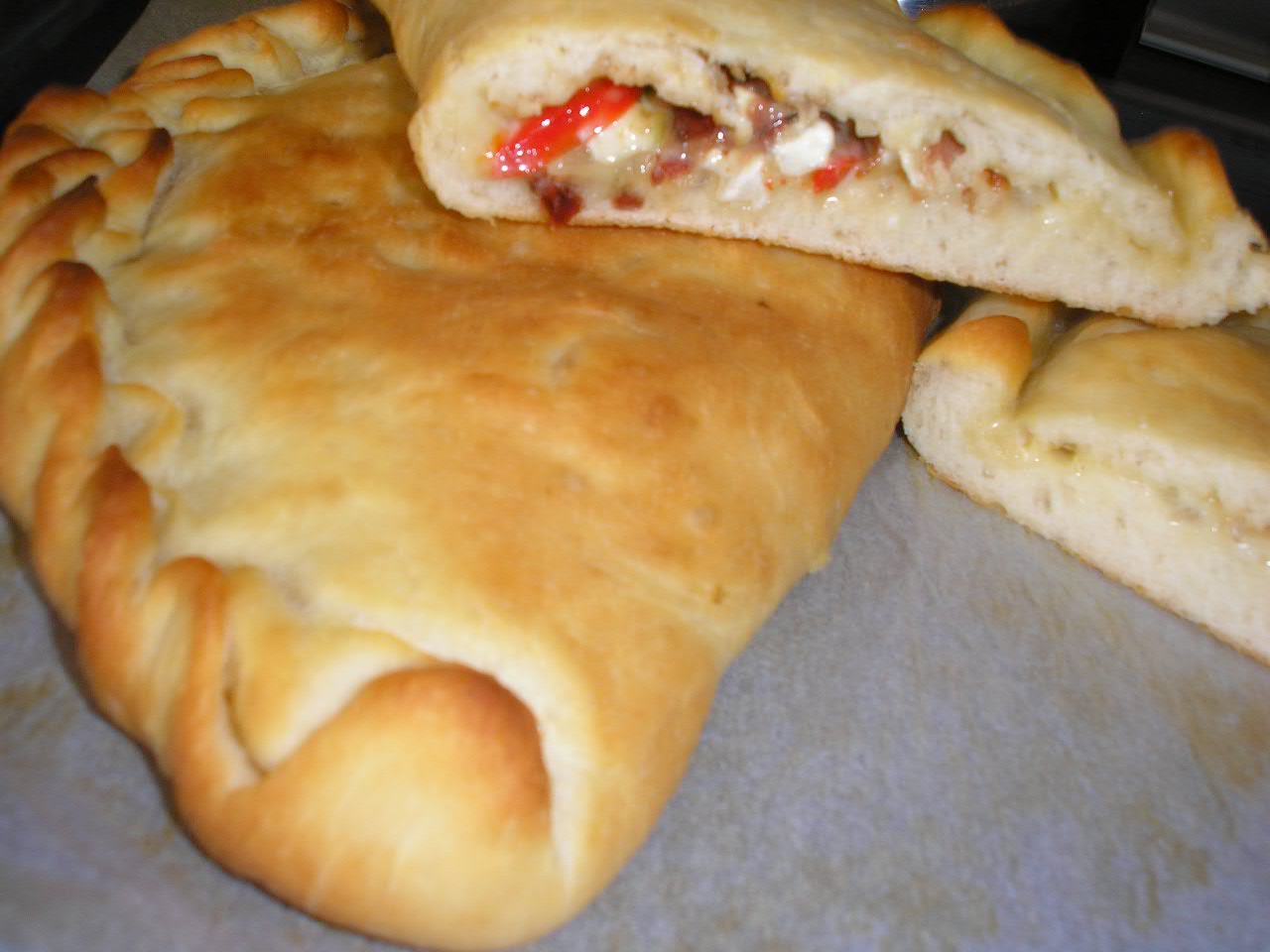 A szalonnát apró csíkokra vágjuk,és megpirítjuk száraz serpenyőben.Kivesszük a zsírjából,és itatós papírra szedjük.A pizzatésztát elkészítjük robotgéppel,és kelesztjük mindaddig,míg a töltelékünket előkészítjük.letakarjuk egy erre alkalamas konyharuhával.Ezután a szalonna zsírjához adunk 1 ek olivaolajat,de lehet vajat is,majd az apróra vágott hagymákat lepirítjuk rajta,és félretesszük.A paprikát hosszúkásra vágjuk,majd félretesszük.A sajtot kockára vágjuk,de lehet rusztikusan szétcsipkedve darabokra.A tésztát kettévágjuk,és 30 cm átmérőjűre köralakúra nyújtjuk.Olivával megkenjük a tészta szélét,és a hagymás tölteléket a szalonnával a közepére rakosgatjuk.Rácsipkedjük a kakukkfűvet,és a paprikát,majd a szardellából 3 db megy rá elosztva,a sajtot is elosszuk mind a két tésztába.Összehajtjuk,és a képen látható módon lezárjuk a széleit.Megkenjük kívül is olivaolajjal,és 200 fokos sütőbe 20 perc alatt készre sütjük.melegen letakarjuk konyharuhával,hogy finoman visszapuhuljon,és tálalhatjuk is.Fontos, hogy olivaolajat használjunk,mert az nem ég meg olyan könnyen.